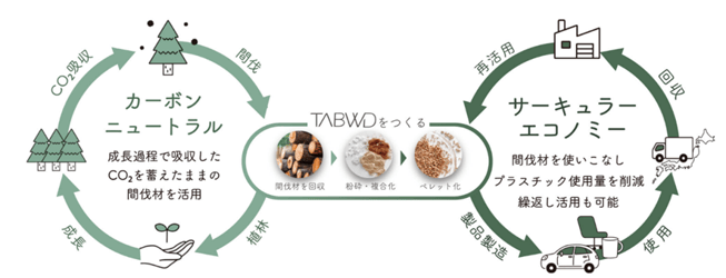 成長過程で吸収した二酸化炭素を蓄えたスギの間伐材を配合することでカーボンニュートラルに貢献。加工しやすく、繰り返し使用することが可能なため、サーキュラ―エコノミ―の実現にも役立ちます。
